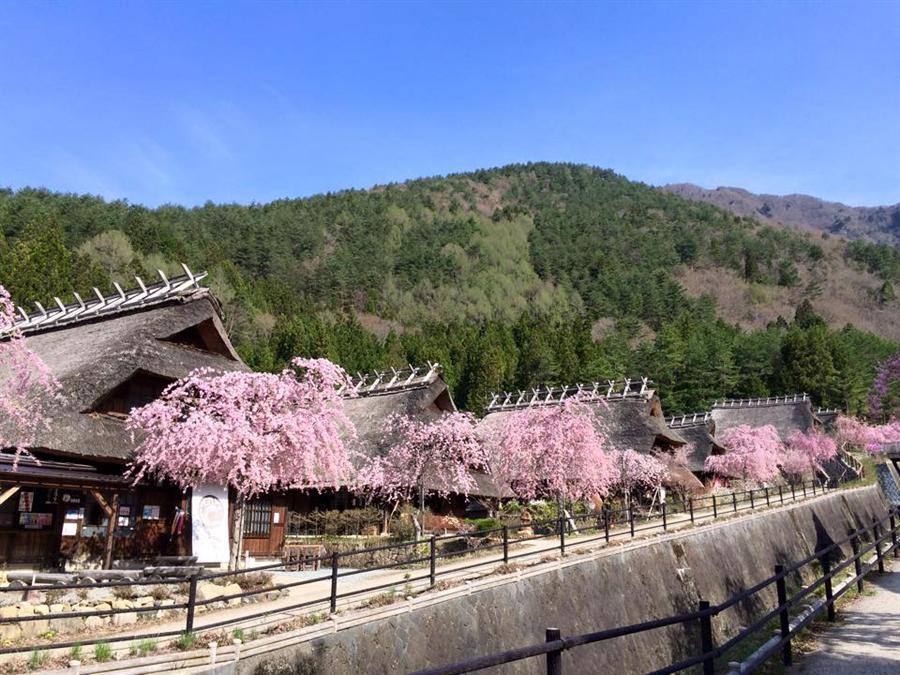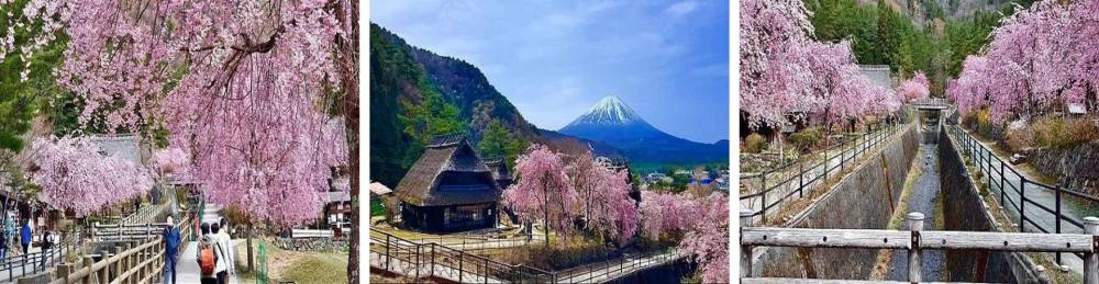 富士五湖之一的西湖旁,(療癒之里根場)是日本少數能夠保留到傳統古日本建築-合掌造的村落,春天期間會有相當多粉色枝垂櫻花綻放,所以曾經被譽為全日本最美麗的合掌造村落▼