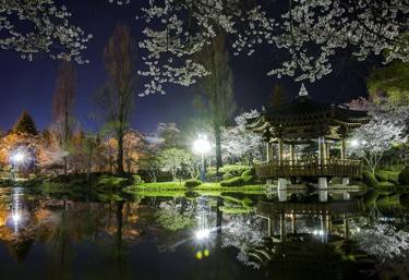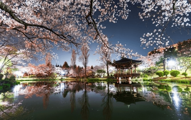 ✦韓國最美50大景點之一<湖光映照千年秘境>~- 雪白與粉色交織的垂枝櫻花如仙境般覆蓋湖面,白日如夢、夜晚更可欣賞七彩燈光點亮的浪漫夜櫻