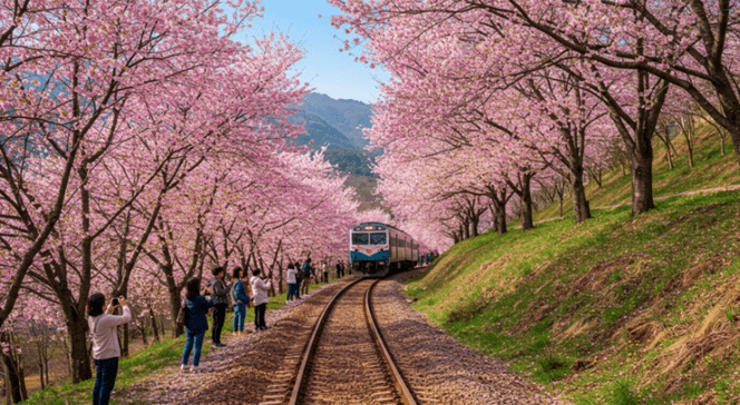 ✦鎮海慶和火車站:以兩側盛開的櫻花隧道最為著名,春季到訪時能拍到火車穿越粉色花海的經典景象。