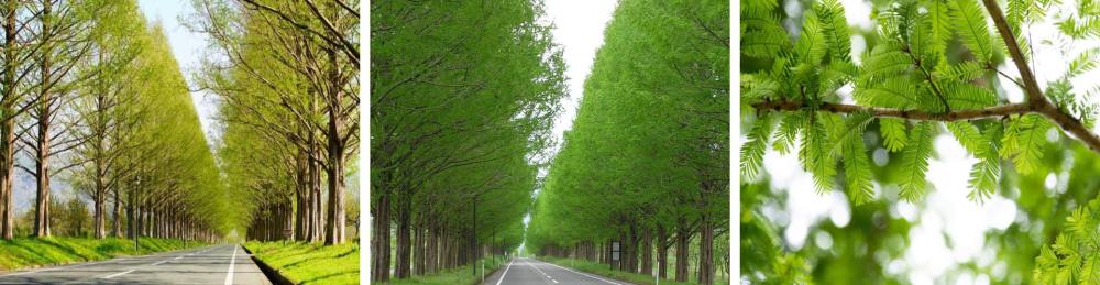 ˙500棵呈圓錐形的水杉樹,<新緑>初生的嫩芽~新綠的季節,成為清爽的黃綠色樹列,展開令人心曠神怡的景色。