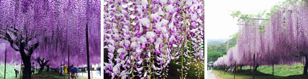 關西賞藤名所,紫色九尺藤花像鋪布一樣流洩而下,「九尺藤(野田長藤)」,花如其名,其花穗非常之長,最高紀錄有180公分